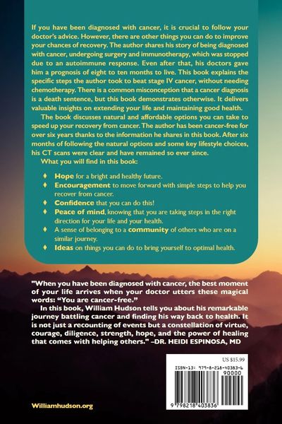 William Hudson shares his story of being diagnosed with cancer and undergoing surgery and immunotherapy, which was stopped due to an autoimmune response. Even then, he was given eight to ten months to live. This book explains the specific steps he took to beat stage IV cancer without needing chemotherapy.